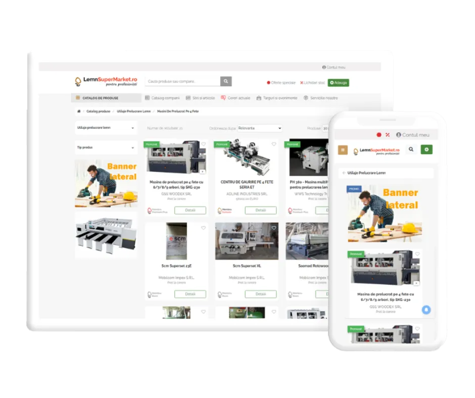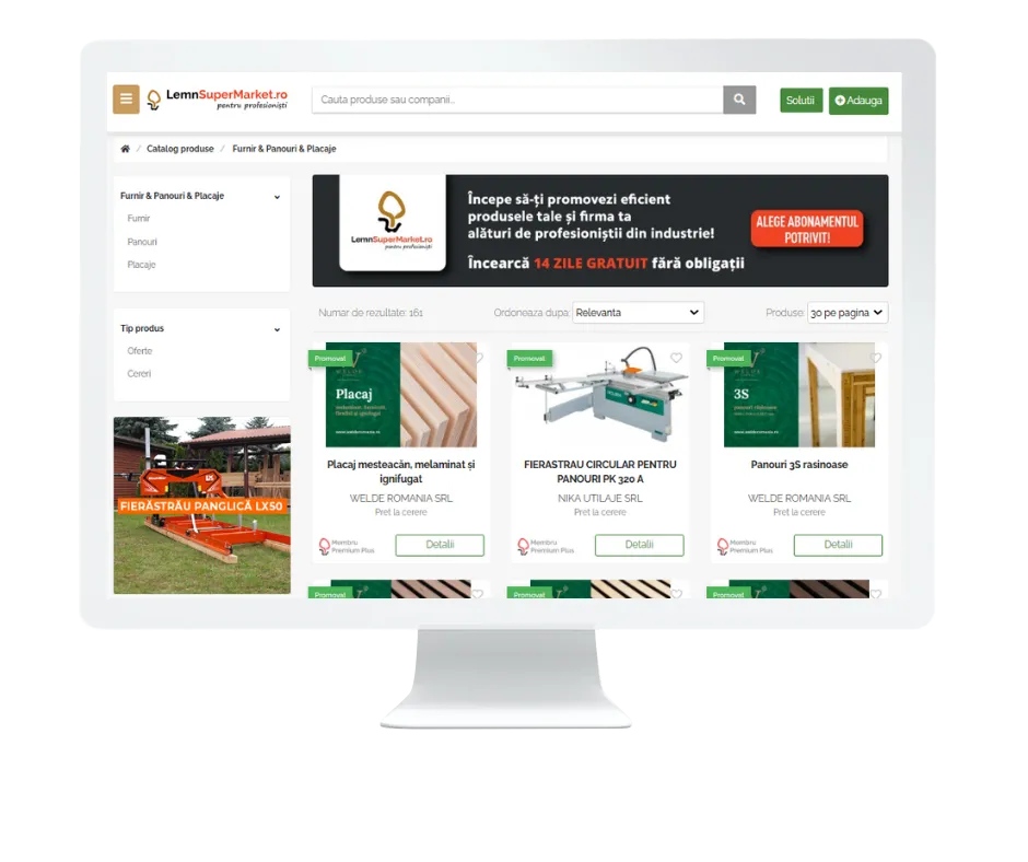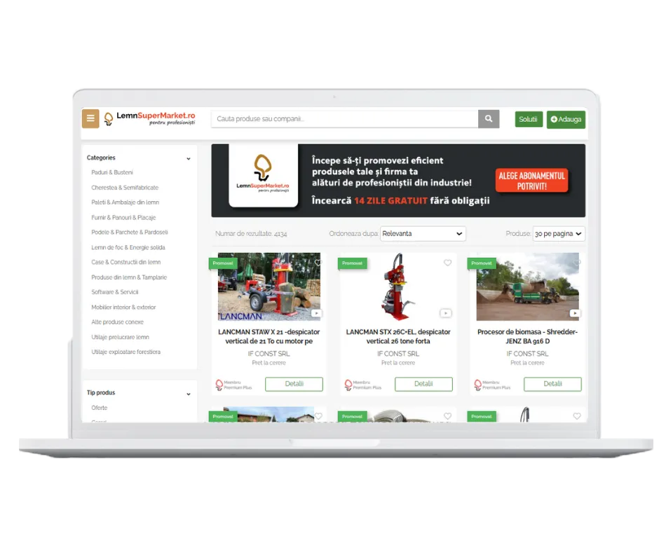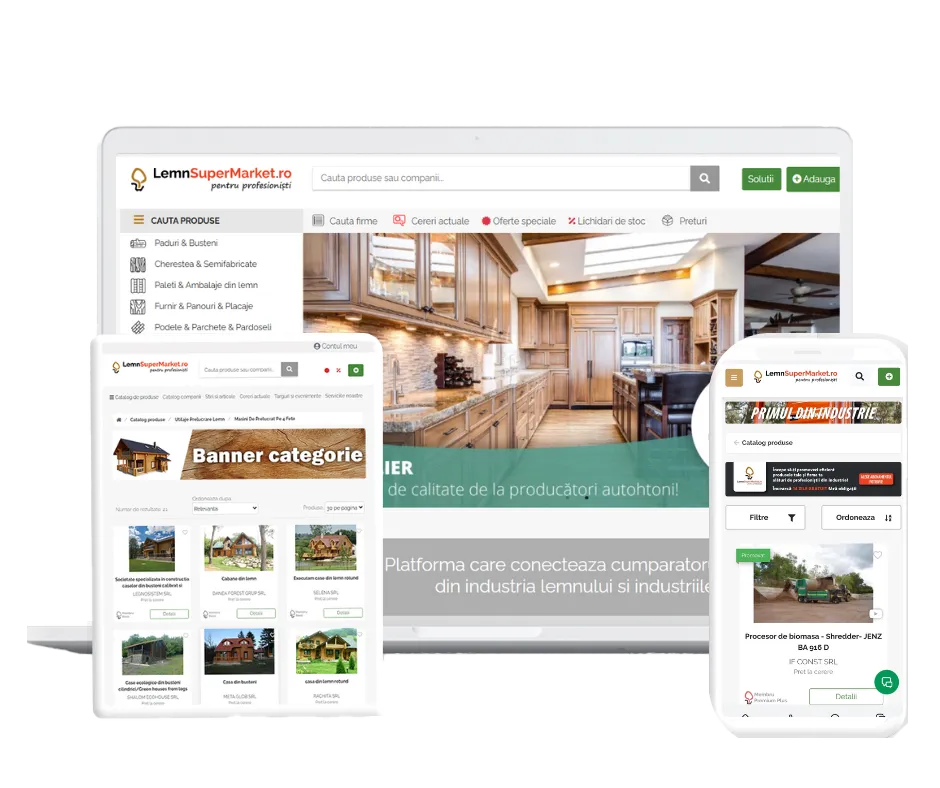 A LemnSuperMarket egy platform, amely összeköti a faiparban érdekelt vásárlót és eladót. Az egyik legnagyobb romániai platform vagyunk közel 5000 hirdetéssel, 2300 céggel és 600 napi látogatóval. Hogyha a faiparban vagy a kapcsolódó ágazatokban vagy érdekelt, itt a helyed!